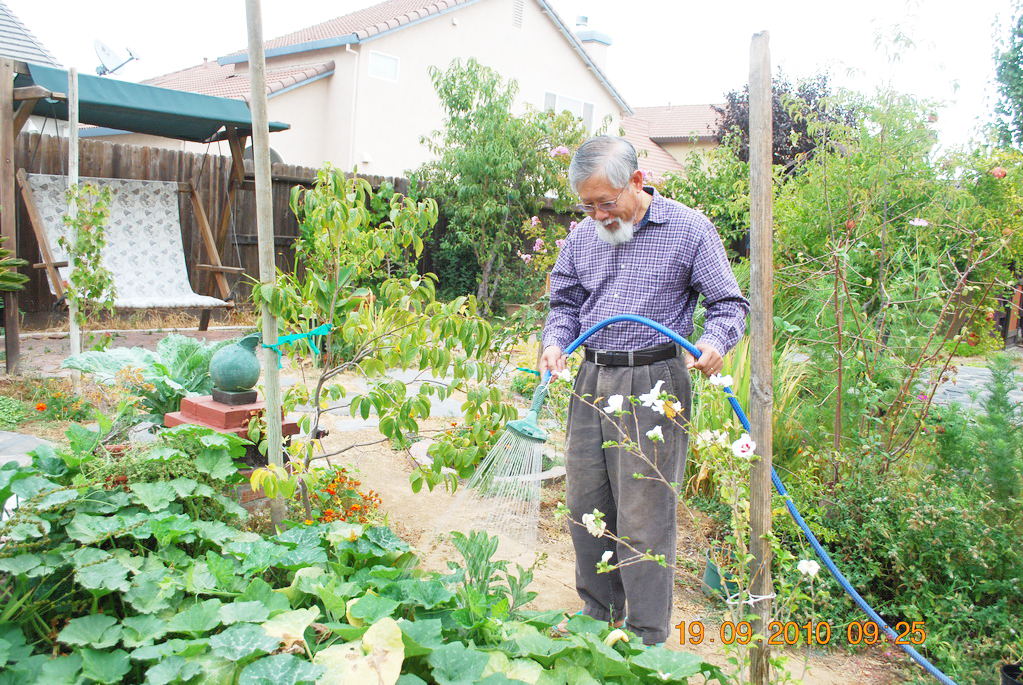 sau nhà có khu vườn nhỏ do thầy Trang tạo dựng. Thầy tự đóng nhà kho,