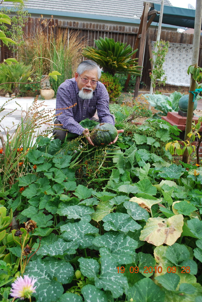 Trang khoe trái bí đỏ mà thầy trồng được trong vườn nhà.