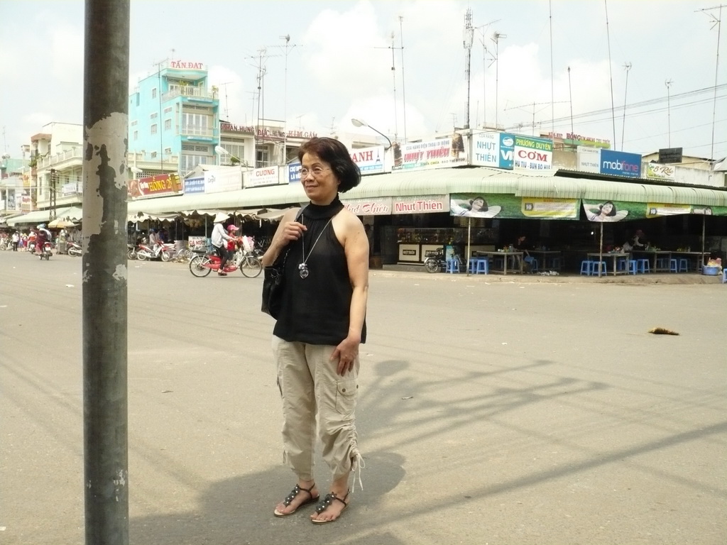 Cô Kim Oanh trước ngôi chợ Mộc Hóa cũ.