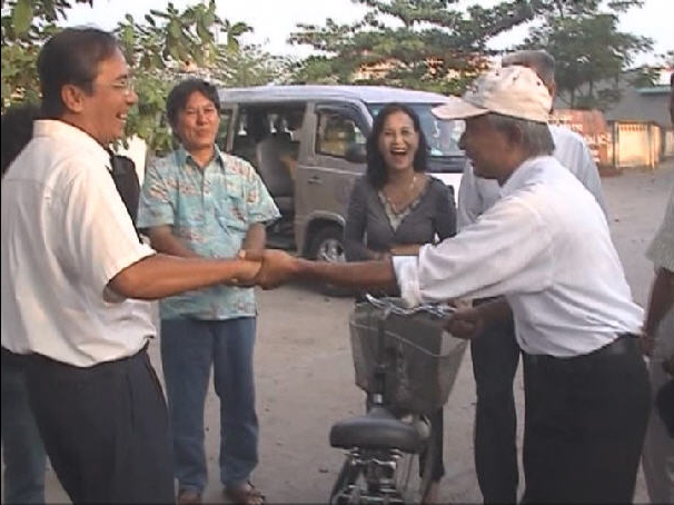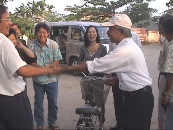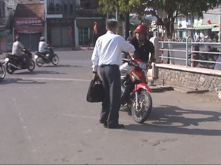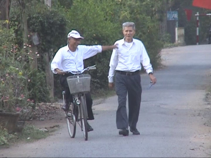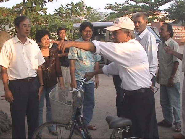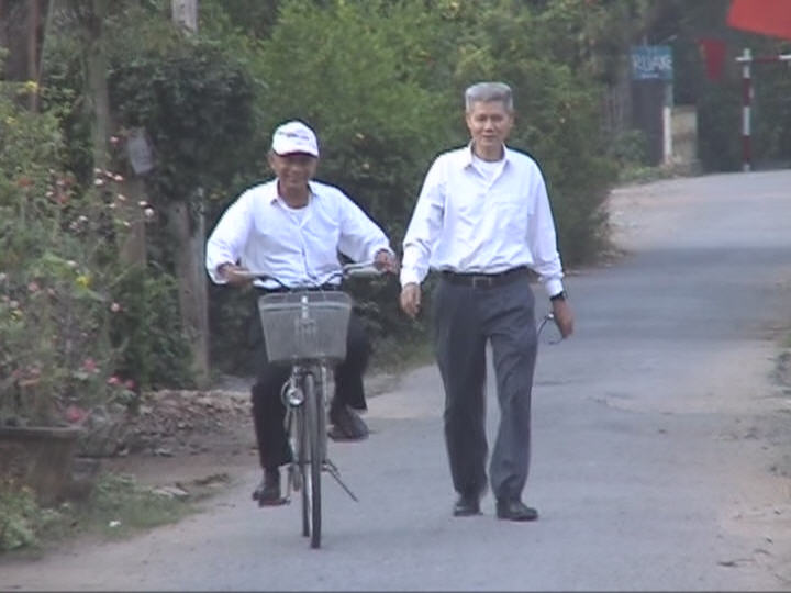 Thầy Đoàn Văn Nhiêu đạp xe từ nhà ra đón