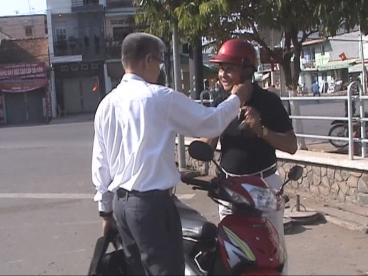 Văn Nhiêu vừa đạp xe, vừa giơ tay khều vai "ghẹo" thầy Võ Xuân Sơn.