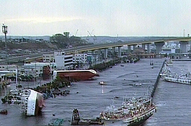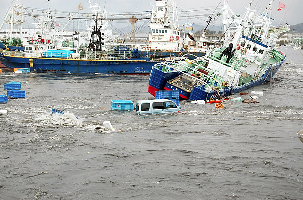 Sóng thần cuốn những chiếc tàu theo dòng nước ở thành phố cảng